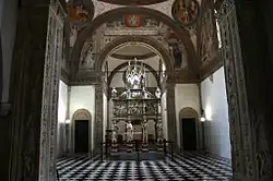 Das Marmorretabel des Hochaltars ist hoch auf die lettnerartige Wand vor dem Chor gestellt, die Kreuzigung wird von acht Reliefs der Passionsgeschichte begleitet, lombardisch um 1400. Hier sind auch die Zugänge zur Hallenkrypta, die 1537 ausgebaut wurde.