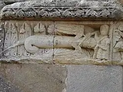 Auf dem Kämpfer der rechten Seite werden die drei Marien mit Salbgefäßen in den Händen am Grab Jesu dargestellt. Ein Engel weist auf das leere Grab. Seitlich stehen ein Mann und eine Frau, beide mit faltenreichen Umhängen bekleidet. Auf dem folgenden Kapitell sind zwei Personen mit ähnlicher Kleidung und einem Buch in der Hand dargestellt. Drei Kapitelle sind mit an den Spitzen eingerollten Blättern verziert, ein anderes mit einem Harpyienpaar. Ein weiteres Kapitell zeigt zwei bärtige Figuren, eine Figur, vielleicht der Apostel Petrus, hält zwei große Schlüssel in den Händen. An die Kapitelle schließt sich auf der rechten Seite des Portals ein Relief mit der Darstellung von neun Personen an, vermutlich ein nicht mehr vollständiger Zyklus der Monatsbilder.