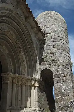 Die Kirche ist aus regelmäßig behauenem Sandstein errichtet. Zwischen Langhaus und Chor erhebt sich ein offener Glockenturm (Espadaña). An die Südfassade schließt sich neben dem Portal ein Rundturm an, der auf einem quadratischen, 4,50 Meter hohen Unterbau aufliegt. Die Funktion dieses Turmes ist nicht eindeutig geklärt, vielleicht diente er zur Verteidigung. In seinem Inneren verläuft eine nur mit einer Leiter erreichbare Wendeltreppe, die zum Glockenturm führt.