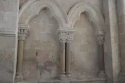 Das einschiffige Langhaus mündet im Osten in einen Chor mit halbrunder Apsis. Sechs Stufen sind notwendig, um den großen Höhenunterschied, bedingt durch den felsigen Untergrund, zwischen Schiff und Chor zu überwinden, weitere drei Stufen führen zur Apsis. Der zugespitzte Triumphbogen, der durch einen weiteren gezackten Bogen verdoppelt wird, ruht auf Säulen, deren Basen auf hohen Sockeln stehen. Die Sockel setzen sich an den Wänden des Chorraums als Bänke fort, über denen Blendarkaden mit Dreipassbögen verlaufen. Diese liegen in der Mitte auf Doppelsäulen mit figürlichen Kapitellen auf, die allerdings stark beschädigt sind. Die Kapitelle am Triumphbogen sind ebenfalls mit figürlichen Szenen skulptiert und die Kämpfer mit Blattwerk verziert. Das Kapitell der rechten Seite stellt ein Greifenpaar dar, das der linken Seite den heiligen Georg, der den Drachen tötet, und den Kampf Samsons mit dem Löwen.