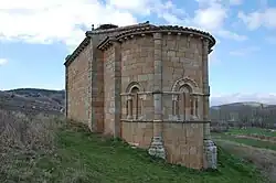 Das einschiffige Langhaus mündet im Osten in einen rechtwinkligen Chor mit halbrunder Apsis. Zwei Dreiviertelsäulen gliedern die Außenmauer der Apsis in drei von je einem Rundbogenfenster durchbrochene Felder. Die Apsisfenster besitzen kunstvoll skulptierte Kapitelle. Auf einem Kapitell sind Harpyien mit phrygischen Mützen zu erkennen, ein anderes Kapitell zeigt den Sündenfall, auf einem Kämpfer ist die Schlange dargestellt. Das mittlere Apsisfenster ist in seinem Bogenfeld mit einem Tympanon besetzt, auf dem eine bärtige Figur mit ausgebreiteten Flügeln unter einem Zackenbogen dargestellt ist.