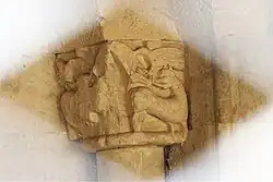 Über dem Portal ist ein Vordach angebracht, das auf Steinplatten aufliegt, in die ein Fries aus zwei übereinanderliegenden Reihen von Halbscheiben eingeschnitten ist. Darunter sind sechs mit menschlichen Köpfen skulptierte Kragsteine erhalten.