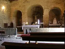 Im Innenraum öffnen sich drei Hufeisenbögen zu den innen rundbogigen Apsiden, deren Gewölbe aus Backstein gemauert ist. Am Gewölbeansatz verläuft ein Sägezahnfries aus Ziegelsteinen. Ein Steinblock in der Nordwand ist mit einem Taubanddekor verziert.