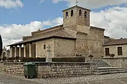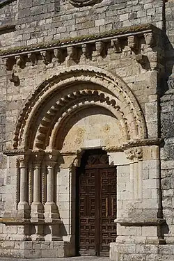 An der Westfassade befindet sich das Hauptportal, ein romanisches Rundbogenportal, dessen drei Archivolten auf beiden Seiten auf drei Säulen aufliegen. Die Archivolten sind mit Rundstäben, Bogenfriesen und Knospen verziert. Das nur mit skulptierten Rosetten versehene Tympanon ruht auf Kragsteinen (mochetas) in Form von menschlichen Köpfen, aus deren Mündern große Blätter wachsen. Im Tympanon ist die Inschrift „Era MCCXXXIII“ eingemeißelt, die auf das Jahr 1233 der Zeitrechnung der spanischen Ära verweist und dem Jahr 1195 der heutigen Zeitrechnung entspricht. Die Portalzone bekrönt ein schmales, mit einem Rollenfries versehenes Vordach auf Kragsteinen, die als Tiere oder Köpfe von Menschen und Tieren gestaltet sind. Farbreste weisen auf eine ursprüngliche Bemalung des Portals hin.