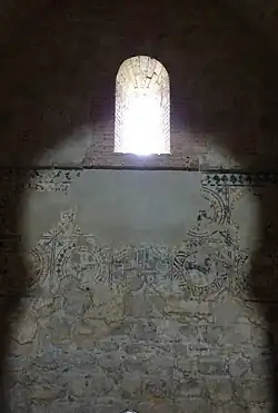An der Stirnwand der Apsis befindet sich eine in schlechtem Zustand erhaltene Wandmalerei in schwarzen und ziegelroten Farben auf weißem Grund. In der Mitte ist ein griechisches Kreuz dargestellt, daneben acht Quadrate, in denen Kreise eingeschrieben sind. In zwei Kreisen sind stilisierte Tiere abgebildet, die als Löwen interpretiert werden. Es ist umstritten, ob es sich dabei um eine – äußerst seltene – mozarabische Malerei handelt oder ob sie aus romanischer Zeit stammt.