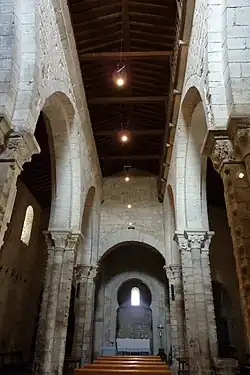 Der Grundriss der Kirche ist ein Rechteck, aus dem die Mittelapsis im Osten leicht hervorsteht. Vom vorromanischen Bau des 10. Jahrhunderts ist noch die Nordwand des Langhauses, das Querhaus, das nicht aus dem Langhaus hinausragt, und der Chorraum mit drei Apsiden, die um 928 datiert werden, erhalten. Die Mauern aus dem 10. Jahrhundert sind durch die Verwendung von Bruchstein, unregelmäßigen Quadern und Ziegeln mit Mörtel gekennzeichnet.
