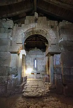 Im Inneren öffnet sich das mit einem gepflasterten Fußboden ausgestattete Querhaus zur ebenfalls mit Pflastersteinen bedeckten Apsis durch einen hufeisenförmigen Triumphbogen, der mit einem ähnlichen Fries wie an der Außenwand verziert ist. Auffällig ist, dass dessen seitliche monolithische Säulen weder Basen noch Kapitelle aufweisen; der Bogen liegt lediglich auf mächtigen mit Reliefs versehenen Kämpfersteinen auf.
