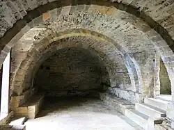 Aus der Zeit, als das Gebäude als Kirche genutzt wurde, stammt für das untere Geschoss die Bezeichnung Krypta. In der Mitte der Längsseite des Gebäudes gibt es auf jeder Seite einen Zugang zu dem Untergeschoss. Es gliedert sich in einen Mittelraum und zwei, im Osten und Westen anschließende Seitenräume. Der Mittelraum wird von einem durch Gurtbögen gestützten, sehr tief ansetzenden Tonnengewölbe überspannt. Die beiden Seitenräume sind holzgedeckt. Der Boden des östlichen Raumes liegt einen Meter tiefer und er könnte als Bad oder Zisterne gedient haben. Der westliche Raum ist nur von außen zugänglich. Auch zum Obergeschoss des Gebäudes gibt es keinen innenliegenden Aufgang.