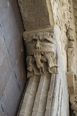 Einen außergewöhnlich reichen Skulpturenschmuck weist das Südquerhausportal auf. Es wird seitlich von zwei Strebepfeilern begrenzt und ist von drei Archivolten überfangen, die auf je drei mit schlanken Skulpturen besetzten Säulen aufliegen. Die Figuren auf der linken Seite stellen die drei Marien dar, Maria Magdalena, Maria, die Mutter Jesu, und Maria Salome, die Mutter der Apostel Johannes und Jakobus. Auf dem Buch, das Maria in der Hand hält, ist eine Inschrift mit dem Namen des Bildhauers zu lesen: MARIA MATER XPI LEODEGARIUS ME FECIT („Maria, Mutter Jesu, Leodegarius schuf mich“). Die Figuren der rechten Seite stellen die Apostel Petrus, Paulus und Judas dar. Um den Hals des Letzteren ist das Seil gebunden, mit dem er sich erhängt hat. Die Konsolen (mochetas), auf denen das Tympanon aufliegt, sind als Kuhkopf und als Ungeheuer, das drei Personen verschlingt, gestaltet.