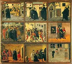 Die ganze Geschichte ist in Tempera auf eine Tafel gemalt, die in neun Quadrate unterteilt ist und die getreue Abfolge der Ereignisse wiedergibt. Die Tafel befindet sich heute im Museo Stibbert.