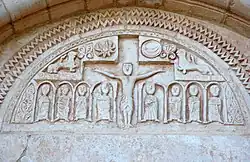 Das halbrunde Tympanonfeld über dem Türsturz zeigt in seiner Mitte den Gekreuzigten. Zu beiden Seiten seines Hauptes befinden sich Sonne und Mond als Zeichen seiner universalen Herrschaft sowie – als Hoheitssymbole – zwei Löwen. Unterhalb der ausgebreiteten Arme Christi stehen in rahmenden Arkaden zwei Gruppen von je vier Personen, die durch nicht vollständig erhaltene Inschriften als Apostel identifiziert werden können. Der Figurenschmuck des Tympanons ist insgesamt sehr ‚primitiv‘ und statisch gehalten; die rahmenden Zackenbögen sind dagegen exakt ausgeführt.