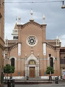Die nach Nordwesten ausgerichtete Kirche ist eine neuromanische, kreuzförmige Backstein-Basilika. 1928/29 erhielt sie den Campanile, der dem Glockenturm des Markusdoms nachgebildet ist. Die Innenausmalung schuf Mario Prayer in den Jahren 1946 bis 1954.