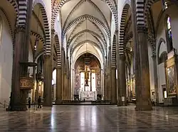 Das Mittelschiff mit Spitzbögen und Kreuzrippengewölbe ist von den Seitenschiffe durch Rundbögen getrennt, die ebenso so hoch wie breit sind, so dass sich weitgehend der Eindruck eines einheitlichen Raumes ergibt. Eine Besonderheit der toskanischen und umbrischen Architektur ist die Ornamentierung von Bögen und ganzen Wänden mit alternierenden Farbschichtungen. Hier sind lediglich die Bögen und Rippen farblich hervorgehoben, in Siena und Orvieto sind es ganze Wände.