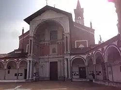 Die geostete Basilika wurde 1365 bis 1388 gebaut und zur Feier der Geburt von Giovanni Maria Visconti, einem Sohn von Gian Galeazzo Visconti, eröffnet.[2] Vor der Terrakotta-Giebelfassade wurde 1497 ein Renaissance-Portikus erbaut, der Donato Bramante zugeschrieben wird und im 16. Jahrhundert von Ptolemäus Rinaldi vollendet wurde. Der Pronaos ruht auf gotischen Kapitellsäulen, an ihn schließt sich ein Säulengang an. Die Kirche wurde 1578 bei einem Besuch des heiligen Erzbischofs Karl Borromäus zur Pfarrkirche erhoben. Im 18. Jahrhundert wurde eine neue Sakristei an der Nordseite des Chors errichtet.