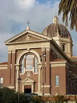 Die Fassade ist nach Südosten in Richtung Meer ausgerichtet. In der Mitte der Fassade tragen zwei korinthische Säulen einen Rundbogen, der ein Christusmonogramm einrahmt. Das Äußere wird von einem 42 Meter hohen Glockenturm dominiert.