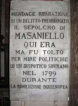 Später wurden zwei Gedenktafeln für Masaniello angebracht: eine im Klostergebäude an der Stelle, wo er ermordet wurde, und eine im Kirchenschiff an der Stelle, wo sich einst sein Grab befand (siehe Abb.).