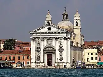 Die auf Fernsicht hin konzipierte, schräg gegenüber von Palladios Pestkirche Il Redentore gelegene Schauseite mit einer durch vier kolossale korinthische Halbsäulen dreigeteilten Fassade besitzt in je zwei übereinander angeordneten großen Nischen Skulpturen der weltlichen Tugenden (Klugheit, Gerechtigkeit, Tapferkeit und Mäßigung), die von Gaetano Susali, Francesco Bonazza, Giuseppe Bernardi Torretti sowie Alvise Tagliapietra geschaffen wurden. Die Fassade aus istrischem Kalkstein wird von einem Dreieckgiebel zusammengefasst. Auch die beiden seitlich an das überrumpelte Presbyterium angebauten niedrigen Glockentürme sind auf Il Redentore bezogen.