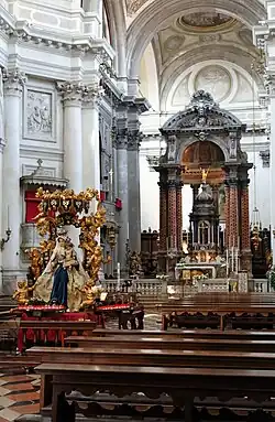 Der unter der Kuppel stehende, mit reichen Marmorinkrustationen geschmückte Hochaltar im Rokokostil wird von einem von 4 Säulen getragenen Baldachin gekrönt. Das Tabernakel aus Lapislazuli gibt dem Gesamten eine prachtvolle Note.