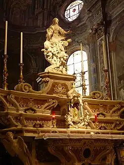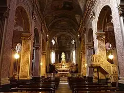 Die umfangreichen Dekorationen mit vielen malerischen und skulpturalen Elementen stammen aus dem 18. und 19. Jahrhundert. Der Hochaltar aus polychromem Marmor stammt aus dem Jahr 1762 und zeigt eine Skulpturengruppe, die die Jungfrau mit Putten darstellt, die das Heilige Haus von Nazareth stützen; sowohl der Altar als auch die Marmorstatue sind ein Werk des Bildhauers Francesco Maria Schiaffino. Die Gewölbefresken im Kirchenschiff sind ein Werk des Malers Lazzaro De Maestri aus dem Jahr 1893. Im zweiten Altar des rechten Seitenschiffs befindet sich das Gemälde Martyrium der hl. Katharina von Alexandria von Castellino Castello; im Chor und in der Apsis befinden sich Werke von Rocco Costa und Giuseppe Galeotti.