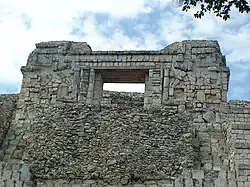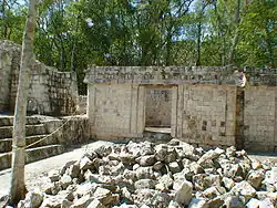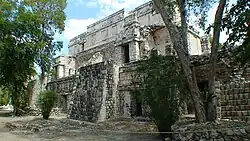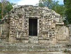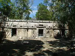 Von dem zu beiden Seiten anschließenden Gebäude sind nur kleine Reste erhalten. Über einem dreigliedrigen Sockel folgt eine, soweit erkennbar, glatte untere Wandfläche. Das mittlere Gesims ist dreigliedrig, in dem vertieften mittleren Band finden sich Gruppen von drei niedrigen Säulchen. Auf der oberen Wandfläche sind ebenfalls Gruppen von drei Säulchen zwischen glatten Wandflächen anzutreffen, die stärker an Formen im Puuc-Mosaikstil erinnern. Das obere Gesims entspricht dem mittleren plus der vorkragenden Steinreihe als oberem Abschluss.