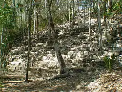 Zu kleinen Seitentempels auf dem zweiten Niveau führen jeweils einzelne Treppen hinauf. Alle anderen mindestens zehn Außentreppen sind nicht funktional, sondern weisen die Steilheit und die Vorwärtsneigung der Treppenstufen auf, die für den Chenes-Stil, aber noch ausgeprägter den Rio-Bec-Stil kennzeichnend sind. Auf diesen Stil verweisen auch die beiden von der Westseite zugänglichen rechteckig gewinkelten Innentreppen, die genau spiegelbildlich zueinander auf das zweite und dritte Niveau führen. Wie bei Maya-Bauten aus statischen Gründen erforderlich, springen die Stockwerke von unten nach oben jeweils um eine Raumbreite zurück.