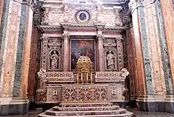 Der Hochaltar (von 1670) sowie das wertvolle Ziborium aus Marmor und vergoldeten Bronzen sind Werke von Dionisio Lazzari und stammen ursprünglich aus der abgerissenen Kirche Sant’Anna di Palazzo[5]. Sie wurden während der erwähnten Restaurierungsphase im 19. Jahrhundert hierher gebracht, während der originale Altar in die Kathedrale von Sorrent verlegt wurde. Auch die Marmordekoration der rückwärtigen Wand stammt von Lazzari.[5]