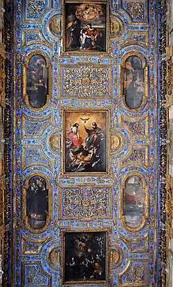 Der Raum erhält einen prägenden Eindruck durch die ganz außerordentliche holzgeschnitzte Kassettendecke in charakteristischem Himmelblau mit goldenen Verzierungen, in die sieben Gemälde eingelassen sind; vier davon stammen von Massimo Stanzione: im Mittelfeld die „Heilige Familie“ (350 × 300 cm)[6] und die „Heilige Dreifaltigkeit“ (400 × 380 cm, in der Mitte)[6], und auf der rechten Seite die „Geburt Christi“[7] und die „Darstellung im Tempel“[7] (beide 130 × 90 cm)[6]. Das dritte Bild des Mittelfeldes, nahe dem Querschiff, ist eine Darstellung der „Verkündigung“ (350 × 300 cm) von Giovanni Bernardino Azzolino (1572–1645)[6], auf der linken Seite befinden sich die „Visitation“ von Belisario Corenzio[7] und eine anonyme Purificazione[7] (beide 130 × 90 cm).[6] Die Decke findet ihre Fortsetzung über dem Nonnenchor, der auf der Empore über dem Atrium liegt (wiederum ganz ähnlich wie in San Gregorio Armeno). Hier befinden sich fünf weitere Gemälde, ein großes in der Mitte und vier kleinere drumherum.