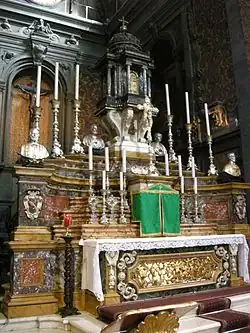 Am Fuß des Altars befinden sich unter dem prächtigen vergoldeten Holzgitter die Reliquien der Heiligen Mario und Maria, dunkle Figuren, die 1615 auf Initiative der Großherzogin Christine von Lothringen aus den Katakomben von San Callisto überführt wurden.