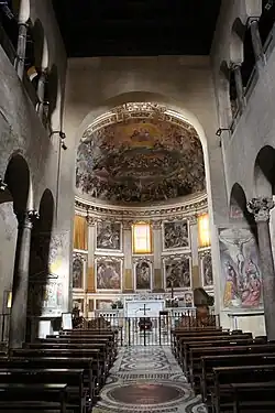 Die Apsis entspricht dagegen in etwa der alten Apsis und ist damit eigentlich von der Proportion zu groß für die heutige Kirche. 1632 malte sie der Fiorentiner Giovanni Menozzi da San Giovanni mit der Heiligenlegende aus. Die oberen vier Bilder zeigen dabei das Martyrium der vier anonymen Soldaten. Die unteren sieben Szenen stellen die Legende der pannonischen Steinmetze dar. In der Wölbung sind die Heiligen im Paradies vereint. Die vier Märtyrer aus Albano bleiben unerwähnt.