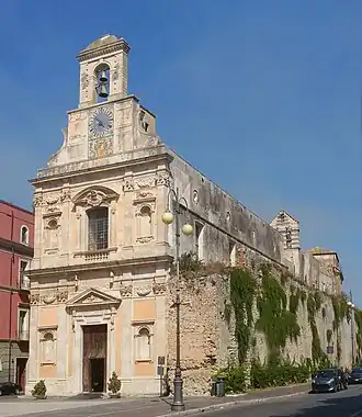 Die barocke Fassade der Kirche stammt von Andrea Lazzari. Sie wird von Lisenen mit korinthischen (Untergeschoss) und Komposit-Kapitellen (Obergeschoss) gegliedert. Der Stuckdekor besteht aus Festons und geflügelten Engelsköpfen (Cherubim, Seraphim) über Portal, Fenster und Nischen des Obergeschosses. Die Bekrönung bilden eine mit Maiolica-Fliesen verzierte Uhr von Matteo De Vivo und ein Glockentürmchen („campanile a vela“), die erst zu Beginn des 18. Jahrhunderts hinzugefügt wurden.[4]