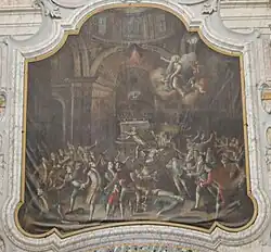 Die Gemälde aus der alten Kirche konnten im Gegensatz zu anderen Gegenständen nicht erhalten werden und wurden ersetzt.[10] In der Gegenfassade an der Haupttür befindet sich La caduta del fulmine (Der Blitzschlag), ein Gemälde von Ludovico Delli Guanti, das an das Ereignis vom 28. März 1779 erinnert, das als Wunder angesehen wird, weil während einer Kontroverse, die zu schweren Beleidigungen führte, die in der Kirche während einer Verwaltungssitzung ausbrach, ein Blitz Angelo Candita tötete, der zu denjenigen gehörte, die den heiligen Ort am meisten beleidigt und beschimpft hatten.[23]