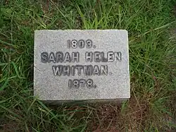 Sarah Helen Whitman starb im Alter von 75 Jahren im Haus eines Freundes in Providence und ist auf dem North Burial Ground begraben.[6] In ihrem Testament verwendete sie den Großteil ihres Vermögens für die Veröffentlichung eines Bandes mit ihren eigenen Gedichten und denen ihrer Schwester. Außerdem vermachte sie Geld an die Providence Association for the Benefit of Colored Children und die Rhode Island Society for the Prevention of Cruelty to Animals.[3]S. 521