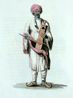 Umherziehende Musikanten begannen ab dem 16. Jahrhundert, ihre religiösen Lieder auf einer einfachen sarangi zu begleiten. Sie wurden nicht geachtet, sondern bestenfalls toleriert. In den Städten konnten sie als Begleiter von Sängern Geld verdienen. Ihr sozialer Rang war deutlich unter den klassisch ausgebildeten Musikern (Binakaras), die Dhrupad auf der rudra vina (auch bin) spielten oder den von Afghanistan eingewanderten rubab-Spielern, den Rababiya, von denen einige hochgeachtet waren, da sie ihren Stammbaum auf den berühmtesten indischen Musiker Tansen (1506–1589) zurückführen konnten. Sarangi-Spieler stammten meist aus den niederen Kasten. Europäische Reisende beschreiben persische und indische edle Tanzmädchen (Kanchanis) an den Mogulhöfen, die hohe Wertschätzung genossen. Nur der eher asketische Aurangzeb versuchte – vergeblich – Tanz- und Musikveranstaltungen zu verbannen.[21] Vom 18. bis zur Mitte des 19. Jahrhunderts war die Blütezeit der sarangi. Für die populären Mädchentänze (Nautch) werden für Südindien als Begleitung zwei sarangi, eine mridangam, eine shrutibox und ein Paar Handzimbeln (jalra) beschrieben. Die europäische Geige ersetzte zuerst in Südindien das einheimische Streichinstrument.