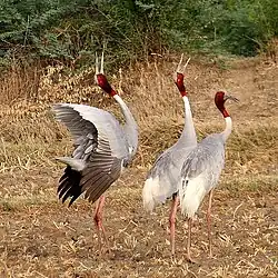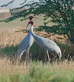 Der Saruskranich (Antigone antigone, Syn.: Grus antigone) gilt mit einer Körperlänge von durchschnittlich 150 Zentimeter als größter Kranich. Er kommt von Indien bis nach Australien vor. Es werden in dem großen Verbreitungsgebiet drei Unterarten unterschieden.[1]