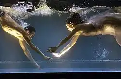 Körper, erster Teil der gleichnamigen Trilogie. Die Kritik würdigte die eindringlichen Bilder, „etwa dann, wenn die 14 Tänzerinnen und Tänzer fast nackt in einen großen senkrecht aufgestellten Glaskasten kriechen, wenn ihre Leiber sich umeinander winden und an den Scheiben plattgedrückt werden. Wie große Reptilien in einem Aquarium ohne Wasser, von unheimlicher Intimität und Befremdlichkeit zugleich.“[11] Die Berliner Zeitung sprach von „Zauberszenen“ und „einer neuen, nie gesehenen Schönheit“.[12] Andere Pressestimmen vermissten die narrativen Elemente[13] und kritisierten die bloße Aneinanderreihung von Szenen, die „nicht in ein choreographisches bzw. inszenatorisches Ganzes“ fügen.[10]