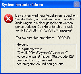 Das Herunterfahren konnte mit dem Befehl shutdown -a unter Start > Ausführen verhindert werden.[3] Jedoch funktionierte Windows bis zu einem Neustart nicht richtig, da lsass.exe ein wichtiger Systemprozess ist.