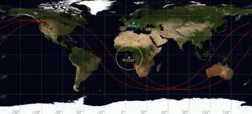 Eine Vorhersage über den Absturzort eines Satelliten auf die Erde ist praktisch nicht möglich. Das Bild zeigt als Beispiel den niedrig fliegenden Satelliten ROSAT, der im Oktober 2011 abstürzte. Während einer 5-stündigen Beobachtung legte der Satellit die als rote Bodenspur markierte Strecke zurück. Die Aufschlagszone für die verschiedenen Trümmerteile bildet immer eine langgestreckte Ellipse in Bahnrichtung. Um den Aufschlagsort auf einen Erdteil einzugrenzen, müsste die Prognose für einen Satellitenabsturz auf 15 Minuten genau sein. Selbst wenige Tage vor dem endgültigen Verglühen sind Bahnstörungen und die Wechselwirkungen mit der Atmosphäre zu groß, um den Einschlagszeitpunkt sinnvoll einzugrenzen. Die Inklination der Satellitenbahn bestimmt, welche Breiten nicht überflogen werden und außerhalb der Risikozone sind. Bei einem polaren Satellit mit fast 90° Inklination ist es die gesamte Erdoberfläche, bei ROSAT mit 53° Inklination der Bereich zwischen 53° Nord und 53° Süd.