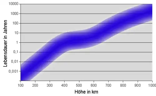 Die Internationale Raumstation umkreist die Erde in einem Abstand von ca. 400 km und verliert pro Tag 50 bis 150 m Höhe. Ohne Bahnanhebungen (englisch Reboost) würde sie in wenigen Jahren verglühen. Ab einer Höhe von 800 km verbleiben Satelliten mehr als 10 Jahre im All, hochfliegende Satelliten praktisch für immer. Außer Dienst gestellt tragen sie erheblich zum Weltraummüll bei. Das Diagramm veranschaulicht die Verweilzeiten. Je höher die Sonnenaktivität, desto weiter dehnt sich die Atmosphäre aus, desto größer ist ihr Einfluss auf höhere Bahnen. Der Knick in der Kurve veranschaulicht die verringerte Sonnenaktivität alle 11 Jahre.