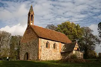 Die Kirche, die sich zwischen dem Hofsee und der Dorfstraße befindet, wurde 1284 erbaut. Nachdem sie im Dreißigjährigen Krieg zerstört worden war, erfolgte ein Wiederaufbau, welcher um 1700 abgeschlossen wurde. Seit Mitte der 1990er Jahre wurden, teilweise durch Spenden finanziert, immer wieder Teile der Kirche restauriert. Das Geläut befindet sich außerhalb der Kirche in einem Glockenstuhl. Oben auf der Glocke ist ein Ornamentband mit dem Spruch „Frieden auf Erden“ befestigt. Auf der Rückseite trägt sie die Inschrift „Franz Schilling Apolda 1919“. Auf dem Friedhof befinden sich Gräber der Adelsfamilie Flotow.[4] Das Pfarrhaus wird heute nicht mehr von der Familie des Pfarrers bewohnt.