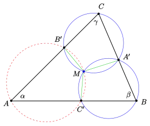 - Es sei ein Dreieck mit den Eckpunkten , den Seiten und drei Punkten auf auf und auf . Dann gilt: Die 3 Kreise durch , und schneiden sich in einem Punkt .
