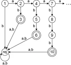 Ausschnitt eines nicht-endlichen, deterministischen Automaten, der die Formale Sprache akzeptiert. Jedes der unendlich vielen Wörter aus L benötigt einen eigenen Pfad zum Endzustand, der Automat müsste also unendlich groß sein.