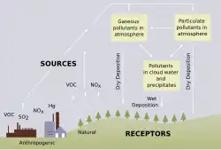 Hauptursache für den sauren Regen ist die Luftverschmutzung, insbesondere durch säurebildende Abgase. Aber auch in der Umgebung von aktiven Vulkanen kommt es zu sauren Niederschlägen. Saurer Regen schädigt Natur und Umwelt und ist ein Hauptverursacher von Waldschäden. Der Zusammenhang zwischen Umweltbelastung und Industrialisierung in Europa wurde zum Beispiel in den skandinavischen Ländern beobachtet.[2] Saurer Regen wird auch durch Transmission (Verteilung der Schadstoffemissionen in der Atmosphäre durch Wind etc.) in weit entfernte Regionen verursacht. Das bedeutet, dass Verursacher und Empfänger von saurem Regen oft verschiedene Staaten sind. Ein weiteres Beispiel ist die transnationale Umweltverschmutzung in Ostasien seit den 1990er Jahren.[3][4]