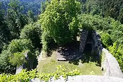 Im Norden steht der restaurierte Bergfried, der etwa 19 Meter hoch ist und einen Durchmesser von fast 8 Metern aufweist und bis zu 2,70 Meter dicke Mauern hat. Er ist als Rundturm ausgeführt und wird in das 13. Jahrhundert datiert. Der mittelalterliche Eingang befand sich in 9 Metern Höhe, wo der Turm noch eine Mauerstärke von 2,10 Metern hat.[32] Der heutige Eingang zum Bergfried wurde erst 1856 in den Mauersockel gebrochen. Der Turm hat heute als Abschluss eine begehbare Plattform und kann als Aussichtsturm bestiegen werden. Eine Zeichnung von 1844[33] zeigt nur noch den hohen Mauerstumpf ohne den oberen Abschluss. Von einer allfälligen Bebauung des Geländes innerhalb des Berings haben sich nur im südlichen Teil Reste eines mindestens zweigeschossigen Gebäudes erhalten, das der Palas gewesen sein könnte. Hierin ist auch der Rest eines Tonnengewölbes sichtbar.