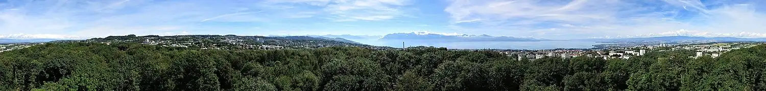Es bietet sich eine Rundsicht mit Blick auf den Stadtteil Sallaz/Vennes/Séchaud und die Vororte Pully und Lutry im Osten; den Genfersee, die Savoyer Alpen und die Stadt Lausanne im Süden; der Stadtteil Bossons/Blécherette, insbesondere auch den Flugplatz Lausanne-La Blécherette und das Stade Olympique de la Pontaise, die Vororte Prilly, und Renens bis nach Morges im Westen und über den Sauvabelin-Wald mit dem Sauvabelin-See im Norden hinweg auf die Jura-Kette.