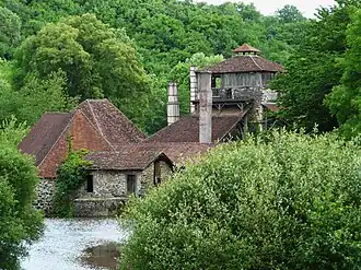 Die Schmiede La Forge mit Nebengebäuden an der Auvézère, darüber das Schloss -