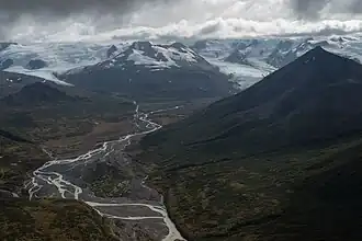 ![]() Oberlauf des Savonoski River; links und rechts oben im Bild der Hook-Gletscher | ||