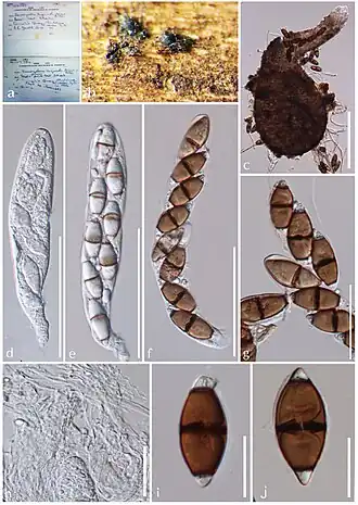 Savoryella lignicola: (a) Herbariumbeleg. (b,c) Fruchtkörper auf Wirt. (d,e) Fruchtkörper. (f) Paraphysen. (g–i) Asci. (j–n) Sporen. Messstriche: (c) 200 μm, (d,e) 100 μm, (g–i) 50 μm, (j–n) 20 μm. | ||||||||||||