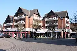 Ostbevern mit der neuen Saxenrast 2014, die Hauptstraße gepflastert und durch breite Bürgersteige zurückgenommen