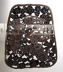 Die Figurenplatten werden in fünf Typen eingeteilt: Die Prinzen sind bei edlen Tätigkeiten und stets mit dem Gesicht im Profil zu sehen. Sie lassen sich an ihren Kostümen, Waffen und anderen Merkmalen unterscheiden. Das Gesicht der Prinzessinnen ist stets frontal dargestellt; bis auf die elegant geschwungenen Gesichtszüge und mehrere Querfalten am Hals ist es freigeschnitten und erscheint leuchtend in der Farbe des Bildschirms. Weitere Typen sind Dämonen, Yakshas (niedrige Himmelsgestalten), mythische Affen und als Nebenfiguren Bauern und Asketen. Adlige Personen tragen einen hohen Kopfschmuck, den ein Strahlenkranz umgibt. Dämonen und Affen sind wahlweise im Profil oder frontal dargestellt. Alle Figuren sind reich geschmückt. Von den mit erhabem Gesicht gezeigten Adligen unterscheiden sich die Kleinbauern, die in komischen und lebensechten Positionen auftreten.[24]