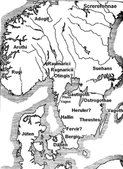 In den fruchtbaren Ebenen von Scandza siedelten die Stämme der Theusten, Vagothen, Bergio, Hallin und Liothida. Diese wurden daher oftmals von anderen Stämmen angegriffen. Nördlich von ihnen lebten die Ahelmil, Finnaithae oder Finnveden, die Fervir und die Gautigoten (Götaland), ein Volk von kräftigen und schnellen Kämpfern. Dann gab es noch die Mixi, Evagre, Otingis, die alle wie Tiere in Höhlen oder in den Fels geschlagenen Burgen hausten, die Ostrogothae, Raumarici, Aeragnaricii und die freundlichen Finnen, die friedfertiger als alle anderen Bewohner Scandzas waren und die den Vinovilothen ähnelten. Jordanes zählte des Weiteren die Suetidi, die größer als die anderen Völker waren. Zu den Dani, die ebenfalls ihre Wurzeln von diesem Stamm ableiteten, gehörten die Heruler, die alle Völker Scandzas überragten. Daneben gab es in ihrer Nachbarschaft noch die Granier, Augandzier, Eunixier, Taetel, Rugier, Arochier und die Ranier.[6]